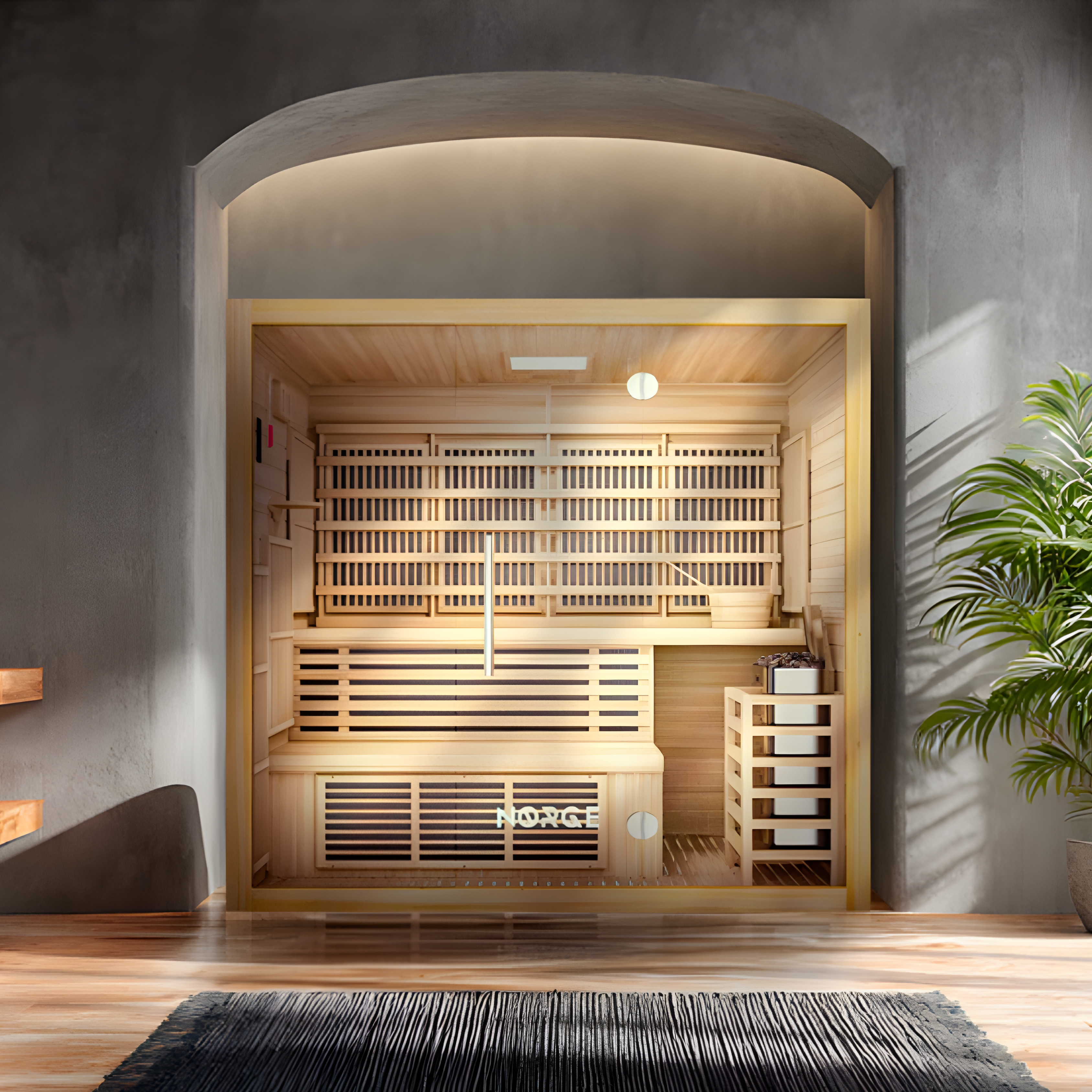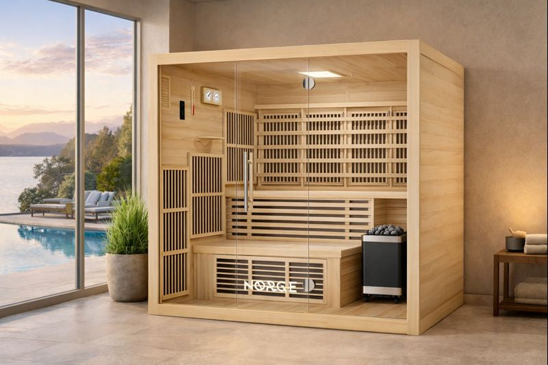 The Nørge Stillhet Hybrid Sauna combines traditional Finnish-style heat with full-spectrum infrared therapy, allowing you to switch between or blend both heat sources for a truly personalized experience. Finnish heat delivers intense, dry warmth that raises your core temperature, promotes deep sweating, and boosts cardiovascular health, while infrared heat penetrates deeply with near, mid, and far wavelengths to support skin rejuvenation, improve circulation, and enhance detoxification. This hybrid approach gives you the best of both worlds—invigorating radiant heat alongside gentle, therapeutic infrared warmth—so you can tailor each session to your wellness needs, recover faster, reduce inflammation, and feel refreshed on every level.